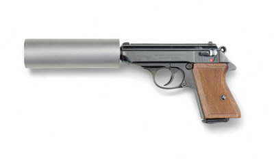 WALTHER A 7.65MM MODEL PPK SELF-LOADING PISTOL, NO. 236394, CONVERTED TO A HUMANE KILLER 8-inch barrel including fixed sound moderator, the receiver with side safety and chequered walnut grips, magazine with reduced capacity, nitro re-proof S5 |