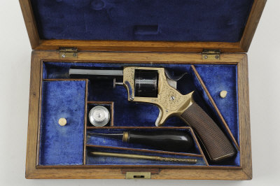 A .30 RIMFIRE TRANTER TYPE SINGLE ACTION REVOLVER, NO. 31 3-inch octagonal barrel, seven shot cylinder, the brass frame with spur trigger and foliate scroll engraving overall, folding ejector spike, chequered walnut grip, retaining much original finish overall, Birmingham black powder proof, in its fitted case with turnscrew, etc S58 |