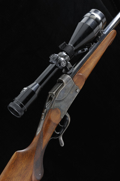 H. BARELLA A GERMAN 6.5X55MM SINGLE SHOT FALLING BLOCK RIFLE, NO. 7063 22 1/2-inch barrel with fixed sights and mounted with a Zeiss Diatal-ZA 8x56 telescopic sight in claw mounts, the frame and push-forward underlever with border and scroll engraving and retaining much original hardening colour, double set triggers, 14-inch figured stock with pistol grip, cheekpiece and recoil pad, 9lb. 14oz., German nitro proof |