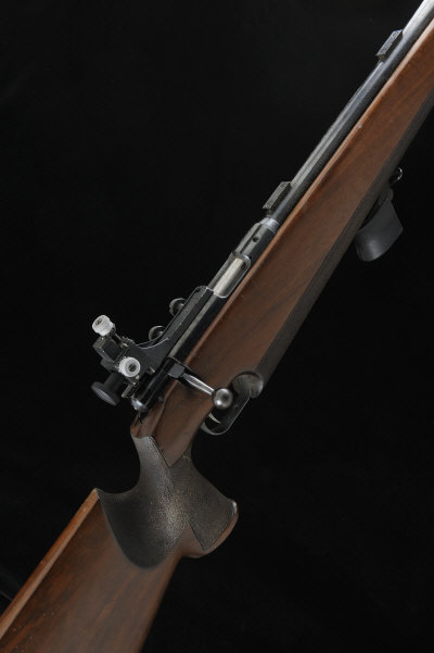 26-inch barrel with tunnel fore sight, the receiver mounted with an aperture rear sight, bolt with flag safety, the half length stock with pistol grip and adjustable butt plate, 13-inch pull, 10lb. 10oz., German nitro proof