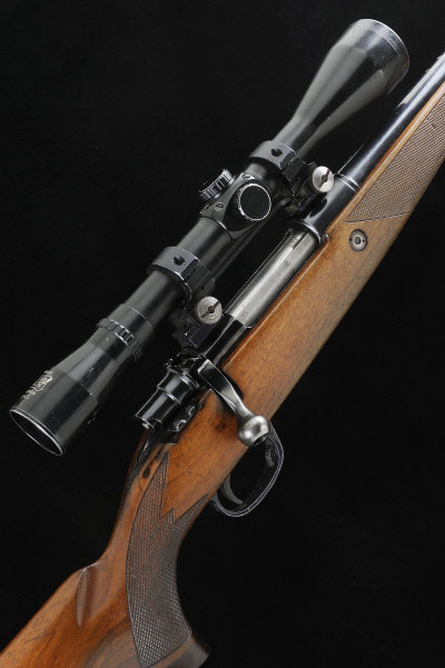 22 1/2-inch barrel, the receiver mounted with a Pecar Champion 6x45 telescopic sight, bolt with side safety, magazine with hinged base plate, half length stock with pistol grip, cheekpiexe and rubber recoil pad, 14-inch pull, 8lb. 4oz., nitro proof