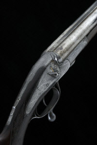 28-inch barrels with full length file-cut rib, folding leaf sight, the frame, back locks and rotary under lever with fine scroll engraving, the maker's name within a scrolling banner, external cocked indicators, 14 1/4-inch stock with pistol grip and perished recoil pad, cracked at the hand, 9lb. 11oz., black powder proof, worn overall
