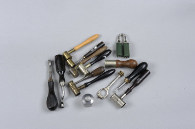 A GROUP OF GUNMAKERS ACCESSORIES including six powder and shot measures, nipple key, striker disc key, pinfire case removal tool, etc |