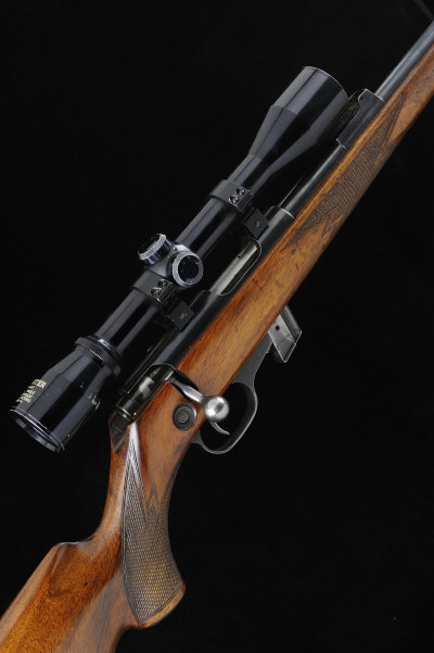 WALTHER A .22 KKJ MODEL BOLT-ACTION SPORTING RIFLE, NO. 35766 22-inch barrel threaded for a sound moderator, ramp fore sight, rear sight removed, the receiver mounted with a Hunter 4x40 telescopic sight, bolt with crossbolt safety, detachable box magazine, the half length stock with pistol grip, cheekpiece and ribbed butt plate, 14-inch pull, 6lb. 10oz., German nitro proof S1 |