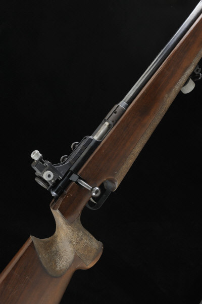 26-inch barrel with tunnel fore sight, the receiver mounted with an aperture rear sight, the half length stock with pistol grip, cheekpiece and adjustable butt plate, 13 1/4-inch pull, 10lb. 10oz., German nitro proof
