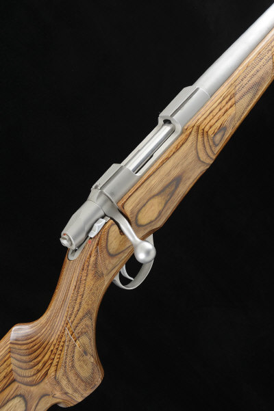 24-inch heavy barrel, the receiver with dove-tail groove, bolt with side safety, detachable box magazine, the half length laminated stock with pistol grip, cheekpiece and rubber recoil pad, 9lb. 9oz., nitro proof