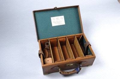 for about 250 cases, with leather straps and oak dividers; together with a leather tube for a telescopic sight (2)