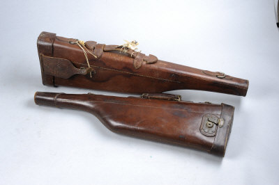 TWO LEATHER LEG-OF-MUTTON GUN CASES with compartments for 28-inch and 30-inch barrels respectively |