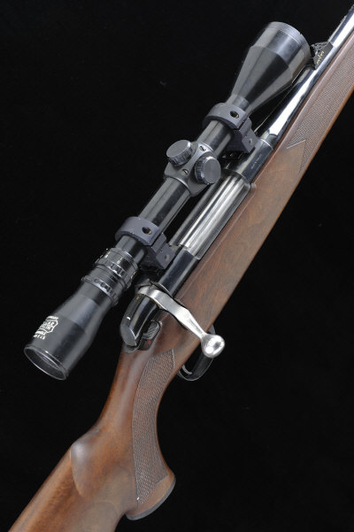 23 1/2-inch barrel with ramp fore sight and adjustable rear sight, the receiver mounted with a Pecar variable 5-10x45 telescopic sight, bolt with side safety, magazine with hinged base plate, the half length stock with pistol grip, cheekpiece and rubber recoil pad, 9lb. 12oz., nitro proof