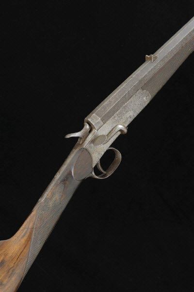 THOMAS JACKSON A .295/.300 HAMMER ROOK RIFLE, NO. 571 28-inch octagonal barrel with machined top surface and folding leaf sights, the plain frame with central hammer and side lever, 14 1/4-inch well figured stock with maker's butt plate, 4lb. 12oz., black powder proof S58 |