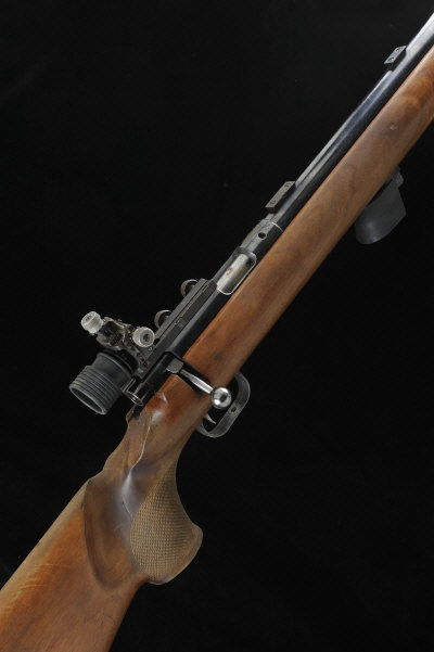 ANSCHUTZ A .22 MODEL "MATCH 54" BOLT-ACTION TARGET RIFLE, NO. 29657 27 1/2-inch barrel with tunnel fore sight, the receiver mounted with an aperture rear sight, bolt with flag safety, the half length stock with pistol grip, cheekpiece and adjustable butt plate, 13 1/2-inch pull, 11lb. 10oz., German nitro proof S1 |