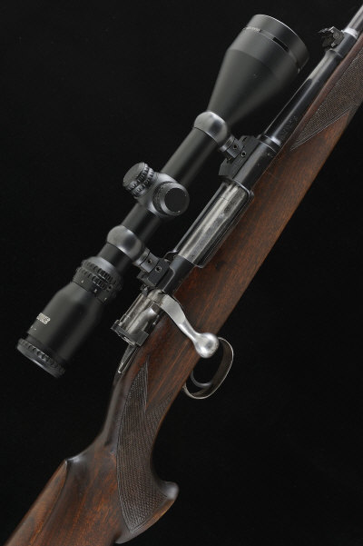 22-inch BSA barrel with muzzle break, ramp fore sight and folding leaf sight, the DWM Mauser receiver mounted with a Hawke telescopic sight, the half length stock with pistol grip, cheekpiece and ribbed butt plate, the magazine base plate engraved "Ray Horan", 13 1/2-inch pull, 8lb., nitro proof