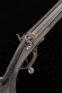STEPHEN GRANT A .500 HAMMER RIFLE, NO. 5060 28-inch barrels with full length rib, rear sight with folding leaf, the rounded frame, rebounding back locks, bolted hammers and rotary under lever with fine scroll engraving, 14 1/2-inch replacement stock with pistol grip and cheek piece, 9lb., black powder proof, re-finished and worn overall