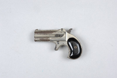 REMINGTON A .41 RIMFIRE OVER AND UNDER DERRINGER 3-inch tip-up barrels, the frame with spur trigger and smooth grips, retaining some of its original nickel plated finish overall; together with a miniature pinfire novelty pistol (2) S58 |