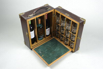 the case with fold-down tray, containing twelve tumblers and space for three bottles