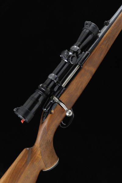 24-inch barrel with ramp fore sight and folding leaf sight, the receiver mounted with a Burris 2-7x telescopic sight, bolt with side safety, magazine with hinged base plate, the figured half length stock with pistol grip, cheekpiece and ribbed butt plate, sling swivels, 13 3/4-inch pull, 8lb. 14oz., nitro proof