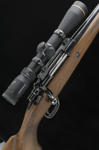 24-inch barrel with ramp fore sight, rear sight removed, the receiver mounted with a Leupold VXR 3-9x40 telescopic sight, bolt with side safety, magazine with hinged base plate, the half length stock with pistol grip and rubber recoil pad, 13 3/4-inch pull, sling swivels, nitro proof