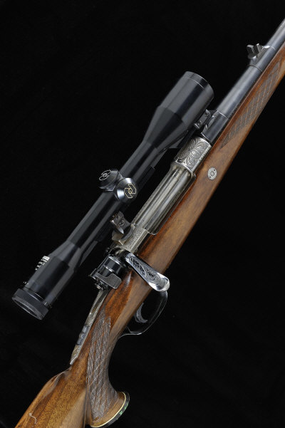MARHOLDT A .378 WEATHERBY MAGNUM BOLT-ACTION SPORTING RIFLE, NO. 31244 27-inch barrel with ramp fore sight and fixed rear sight, the receiver engraved with oak leaves and mounted with a Zeiss Diatal-Z 6x42 telescopic sight in quick detachable claw mounts, bolt with flag safety, magazine base plate engraved with a moose, recoil stud, half length stock with pistol grip, cheekpiece and recoil pad, 14 1/2-inch pull, 10lb. 10oz., Austrian nitro proof S1 |