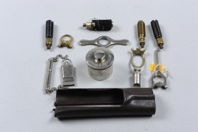 W. W. GREENER A NICKEL PLATED OIL BOTTLE with removable lid, of large size; together with a group of gunmakers accessories, including: cartridge extractors, whistles, cartridge sizer, etc |