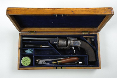 WITTON DAW & CO. A FINE 40-BORE PERCUSSION REVOLVER 6 1/4-inch octagonal barrel with micro-groove rifling, fixed sights, the open pepperbox frame and cylinder with border and scroll engraving, and retaining much original hardening colour, chequered walnut grip with engraved cap, black powder proof, barrel appears to have been expertly refinished, in its fitted oak case with tools, etc S58 |