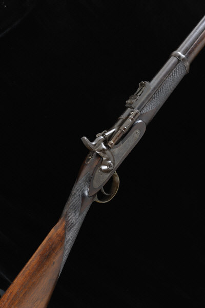 JAMES KERR & CO. A .577 SNIDER ENFIELD THREE-BAND VOLUNTEER RIFLE 36 1/2-inch barrel with folding ladder sight and impressed with retailer's mark "T. Turner", the breech block engraved with the number '3', the lock plate signed by the maker together with a crowned 'VR', full length stock chequered at the hand and including 1 1/4-inch extension/repair, brass furniture, 8lb. 12oz., black powder proof S58 |