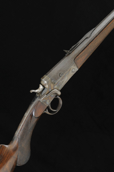 T. BLAND & SONS A .22 SINGLE BARREL HAMMER RIFLE, NO. 16748, CONVERTED FROM A ROOK RIFLE 28-inch octagonal Parker rifled barrel with file-cut top surface and raised fore sight, adjustable rear sight, automatic ejector, the frame, central hammer and side lever with scroll engraving and retaining much original hardening colour, 14 1/2-inch figured stock with semi pistol grip, 5lb. 7oz., nitro proof S1 |
