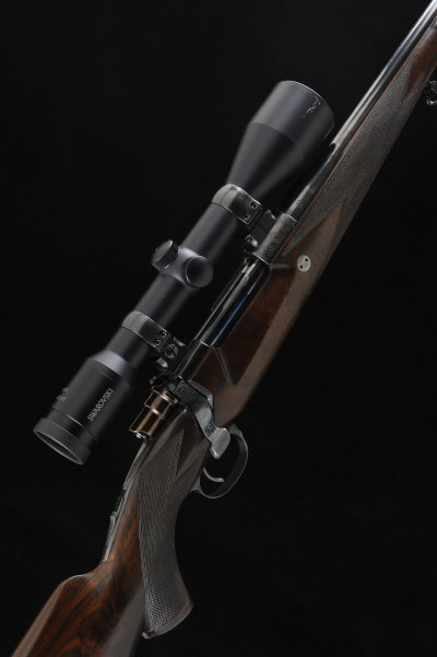 24-inch barrel, the Mauser 98 receiver mounted with a Swarovski Habicht 8x50 telescopic sight, recoil stud, the bolt with David Lloyd-style handle and tang safety, magazine with hinged base plate, engraved overall with Celtic strapwork, half length well figured stock with pistol grip, cheekpiece and rubber recoil pad, 14-inch pull, sling swivels, slight repaired crack at the hand, 9lb. 2oz., nitro proof