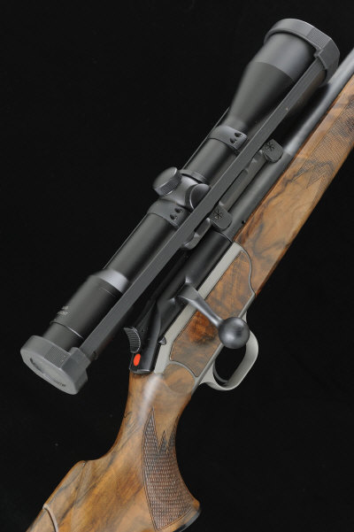 BLASER A 7MM REM MAG R93 MODEL BOLT-ACTION SPORTING RIFLE, NO. 9/154100 (THE RECEIVER NO. J12843) 25-inch barrel fitted with a sound moderator, mounted with a Swarovski 8x50 Habicht telescopic sight in quick detachable mount, the highly figured stock and fore-end with pistol grip, adjustable comb and rubber recoil pad, 14 1/2-inch pull, 11lb., German nitro proof S1 The rifle appears little used. |