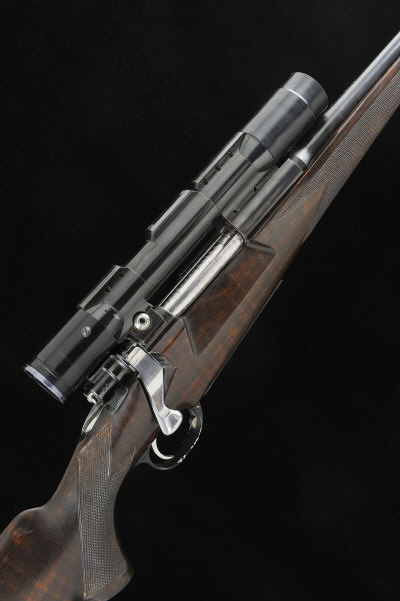 24-inch barrel, the Mauser 98 receiver mounted with a Swarovski Tirol Habicht 4 telescopic sight in David Lloyd mount, bolt with side safety, magazine with hinged base plate, the half length well figured stock with pistol grip, cheekpiece and rubber recoil pad, 13 1/2-inch pull, 8lb. 4oz., nitro proof