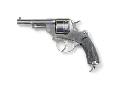 4 1/2-inch barrel, the solid frame with loading gate and ejector rod, cleaned bright overall, chequered walnut grip with lanyard loop, St. Etienne proof