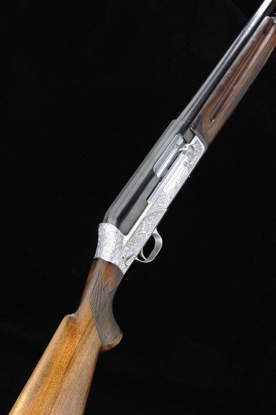 BREDA AN ITALIAN 12-BORE SELF-LOADING GUN, NO. 68719 28-inch barrel with screw-on choke tube, the alloy receiver profusely engraved with foliate scrollwork surrounding scenes of game in landscapes, unrestricted magazine capacity, 14-inch stock with pistol grip, 7lb. 6oz., Italian nitro proof |