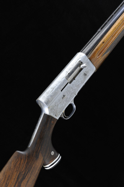 BROWNING A SCARCE BELGIAN 12-BORE FUNKEN ENGRAVED SELF-LOADING GUN, NO. 5511637 31 1/2-inch barrel with 2 3/4-inch chamber, about 3/4 choke boring, machined ventilated rib, magazine with unrestricted capacity, the receiver profusely engraved with hunting scenes, the left side with wild boar and dogs in landscapes, the upper surface with wildfowling scenes, the right hand side with a stag and hounds, the top surface with a scene of pheasants in landscape, signed by the engraver, F. Funken, 14-inch stock with pistol grip, pegged at the head, 8lb. 7oz., Belgian nitro proof