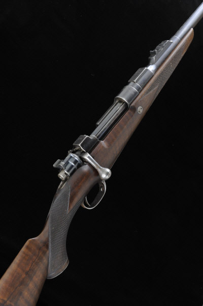 24-inch barrel with ramp fore sight with folding hood, raised rear sight with folding leaves to 400, square bridge magnum Mauser action, bolt with flag safety, magazine with hinged base plate, recoil stud, the well figured half length stock with pistol grip and ribbed butt plate with trap, sling eyes, 14 1/2-inch pull, 8lb. 2oz., nitro proof