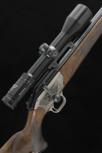 BLASER A .416 REM MAG R93 MODEL STRAIGHT PULL BOLT-ACTION RIFLE, NO. 9/00950 24-inch ported barrel with ramp fore sight and raised rear sight, mounted with a Zeiss Varipoint M 2.5-10x50 telescopic sight in quick detachable mount, the receiver engraved with scenes of deer against Highland landscapes, the half length stock with pistol grip, cheekpiece and rubber recoil pad, 15-inch pull, 11lb., German nitro proof S1 |