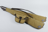 A PAIR OF FULL-LENGTH CANVAS GUN SLIPS AND MATCHING CARTRIDGE BAG the slips with leather trim, straps and sheepskin lining, the bag with leather trim, new condition |
