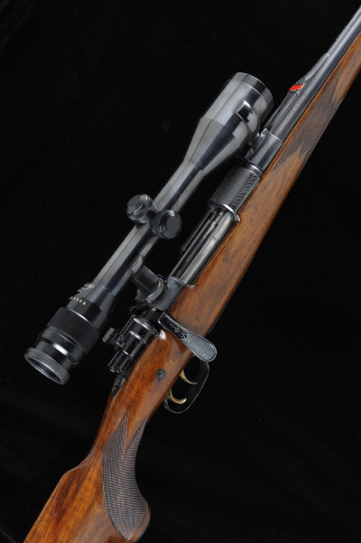 AUGUST SCHULER AN 8X68S BOLT-ACTION SPORTING RIFLE, NO. 28058 26-inch barrel with ramp fore sight and folding leaf sight, the engraved receiver mounted with a Swarovski Tirol Habicht 6 telescopic sight in quick detachable claw mounts, bolt with flag and side safety, engraved magazine base plate, double set triggers, three-quarter length figured stock with pistol grip, cheekpiece and recoil pad, 14 3/4-inch pull, 9lb. 3oz., nitro proof S1 |