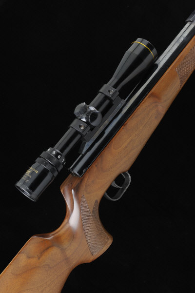 19 1/2-inch barrel including sound moderator, the receiver mounted with a Nikko Sterling telescopic sight, the half length stock with pistol grip, cheekpiece and rubber recoil pad, 14 1/2-inch pull, 9lb. 8oz.