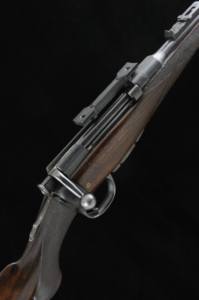 25-inch barrel with hooded fore sight, the rear sight with folding leaves to 300 and ladder to 1000, the receiver fitted with a Parker Hale scope rail, bolt with tang safety, detachable five-shot magazine, 14 1/2-inch figured stock with pistol grip, sling eyes, ribbed ebonite butt plate, 7lb. 2oz., nitro proof