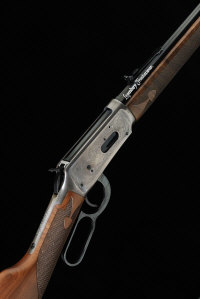20-inch barrel with adjustable rear sight, full length magazine tube, the receiver with commemorative scenes, 13 1/4-inch stock with crescent butt plate and commemorative medallion, 6lb. 13oz., nitro proof, in its factory carton
