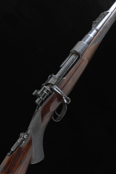 WESTLEY RICHARDS A .318 ACCELERATED EXPRESS BOLT-ACTION SPORTING RIFLE, NO. LT39452 22-inch barrel with ramp fore sight with folding hood and moon bead, the raised rear sight with folding leaves to 500, the receiver with matted top surface and scroll engraving, bolt with flag safety, magazine with hinged base plate, folding tang sight, the half length stock with pistol grip, cheekpiece and chequered butt plate with trap, sling eyes, 14 1/2-inch pull, 7lb. 13oz., nitro proof S1 The maker confirms that the rifle was built in 1913. |