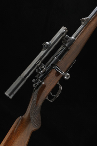22-inch barrel with ramp fore sight, rear sight with folding leaf, the receiver mounted with a Zeiss Zielklein telescopic sight in quick detachable claw mounts, bolt with flag safety, detachable box magazine, the half length stock with cheekpiece and chequered butt plate, 13 3/4-inch figured stock, 8lb. 9oz., Geramn nitro proof