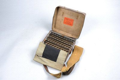 McARTHUR & PRAIN A LEATHER GANNOCHY RAPID LOAD CARTRIDGE CASE the leather covered metal frame with spring clips for 100 12-bore cartridges, with cloth rain cover, the lid with maker's label, stamped with the maker's name in various places, leather and canvas strap |