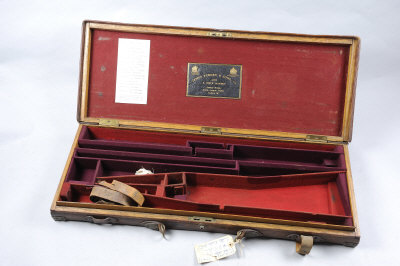 J. PURDEY & SONS A BRASSBOUND OAK AND LEATHER GUN CASE with compartment for 30-inch barrels, the interior re-fitted for gun no. 16073 and two extra pairs of barrels |