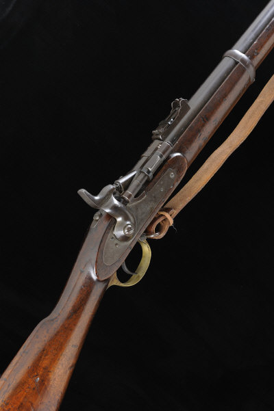 ENFIELD A .577 SNIDER SERVICE RIFLE 36-inch barrel with folding ladder rear sight and three barrel bands, breech block stamped "BSA", the non-rebounding lock with Queen's crown and dated 1864, the full length stock with brass furniture and ramrod, 13-inch pull, 9lb. 7oz. S58 |