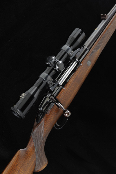 HOLLAND & HOLLAND A .308 SHOT & REGULATED MODEL BOLT-ACTION SPORTING RIFLE, NO. 01 24-inch barrel with ramp fore sight and fixed rear sight, the Husqvarna receiver mounted with a Carl Zeiss Diatal-DA 4x32 telescopic sight, bolt with side safety, magazine with hinged base plate, recoil stud, half length stock with pistol grip, raised comb and ribbed butt plate, 14 1/4-inch pull, 8lb. 1oz., nitro proof S1 It is believed that this rifle was the prototype for the line of Shot & Regulated rifles at Holland & Holland produced during the 1970s and 1980s. |