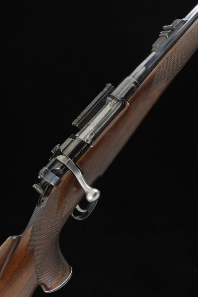 23 1/2-inch barrel with ramp fore sight and folding leaf sight, the receiver with Griffin & Howe type side mount, bolt with side safety, the half length well figured stock with pistol grip, cheekpiece and rubber recoil pad, 14 1/2-inch pull, 9lb. 5oz., nitro proof