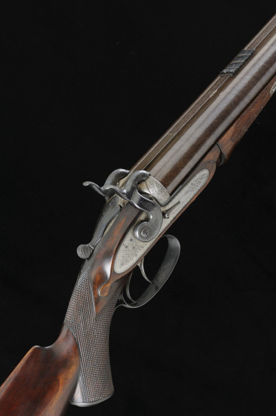 WESTLEY RICHARDS A SCARCE 10-BORE BAR-IN-WOOD HAMMER RIFLE, NO. 12266 26-inch damascus barrels with 2-inch chambers, the broad flat rib with stippled top surface and with folding leaf sight to 300, with octagonal semi-smooth rifling, the frame, locks, bolted hammers and patent top lever with fine scroll engraving, 14-inch figured stock with pistol grip, cheekpiece and ribbed butt plate, 10lb. 5oz., black powder proof S58 The maker confirms that the rifle was completed in November 1871 for J. Watts Garland and was specified as a 10-bore rifle. It has a short 2-inch 10-bore chamber, however is proofed at the size 12 as this reflects the bore diameter across the lands of the rifling.
