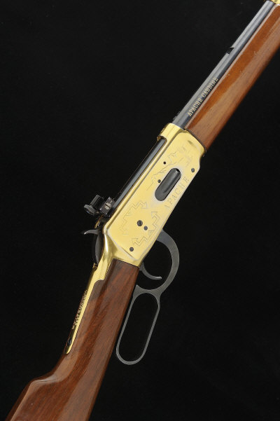 20-inch barrel with tunnel fore sight, rear sight removed, half length magazine tube, the gold plated receiver with loading gate and Apache motifs, fitted with a Williams adjustable aperture rear sight, 13-inch stock with Apache medallion and plated steel butt plate, 6lb. 6oz., nitro proof