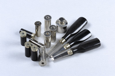 HOLLAND & HOLLAND A GROUP OF GUNMAKERS ACCESSORIES including 5 pairs of snap caps, an oil bottle, a pair of horn-handled turnscrews and a striker disc key |