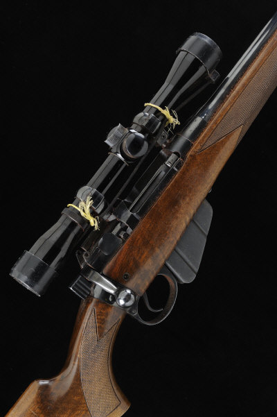 22-inch barrel with ramp fore sight, the receiver mounted with a Bushnell Banner telescopic sight, bolt with side safety, detachable box magazine, the half length stock with pistol grip, cheekpiece and ribbed butt plate, 14-inch pull, 8lb. 14oz., nitro proof, together with two spare magazines, charger clips, etc